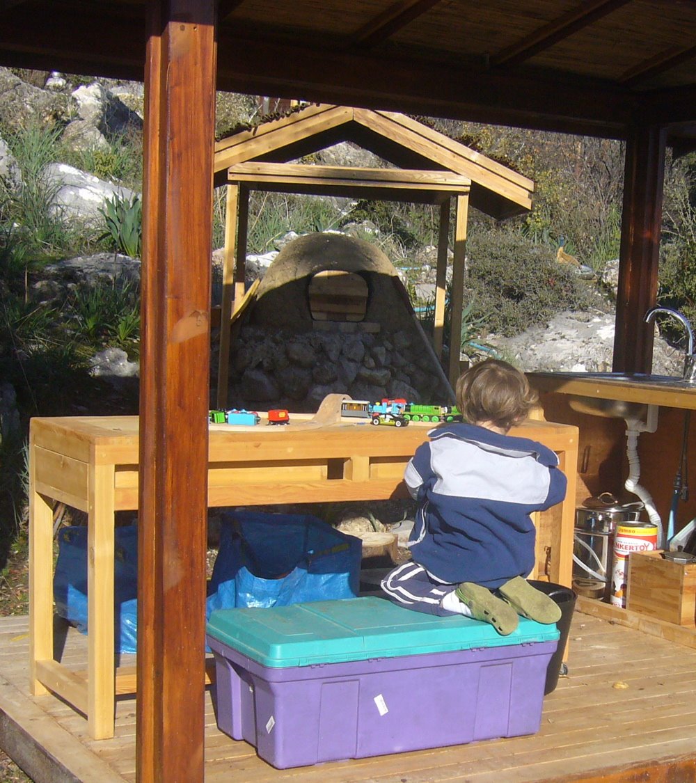 Baki has adopted the outdoor kitchen as a play area, and it is working out well because his figure-8 train track fits nicely on to the table out there. It also has the distinct advantage of being clearly visible from the (indoor) kitchen sink, so I can keep an eye on him.