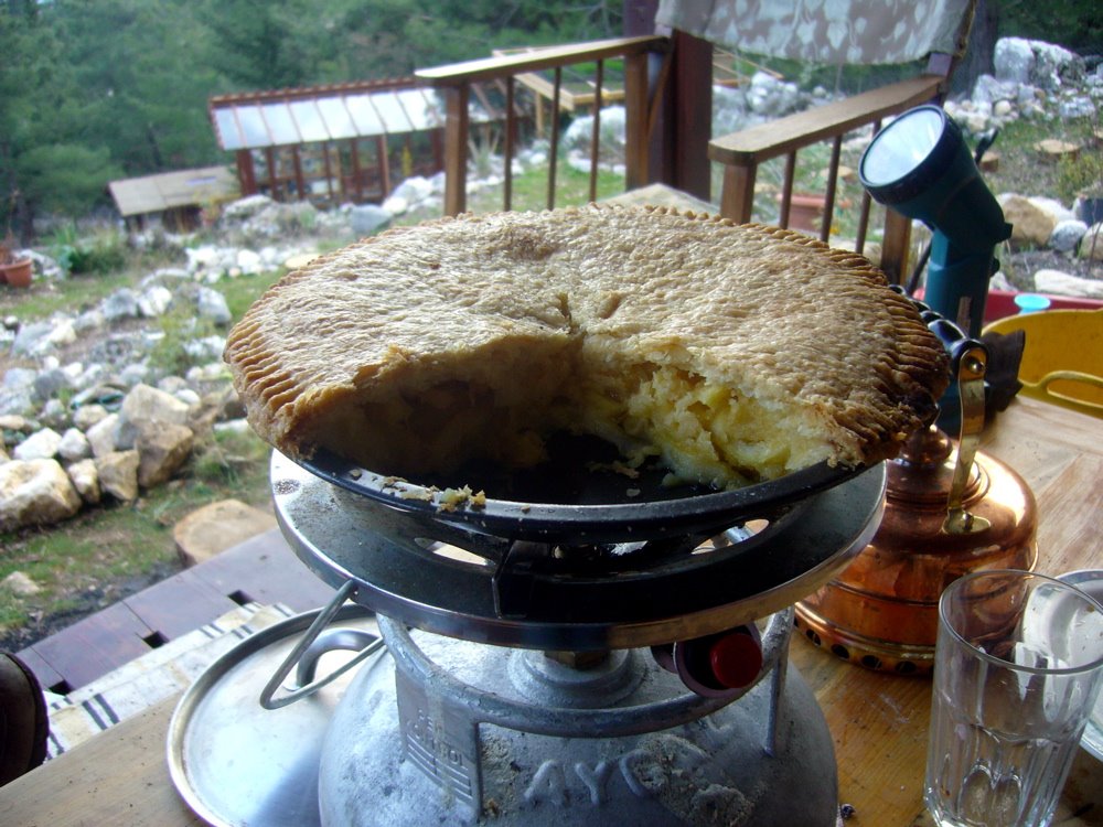 >So I got this email from Uncle Wei about my mom’s trip to L.A. and it had all these great pictures in it. One of them was of this outrageous lemon meringue pie that my mom and Martha made. Well, I can’t really look at a photo like that without wanting pie, and since today was a baking day and we had all of these lemons from our friend’s orchard, i thought i would make a pie too. I found a recipe that I have always wanted to try for lemon pie. It had the advantage of being a double crusted pie, which I have always wanted to try because hey, why stop at 8T of butter when you can use 16? Then you take two lemons and zest them, then slice the whole lemons, pith and all really really thin. Then you throw all that in a mess of sugar (2 cups!) and then let it sit for as long as you can stand (I gave it three hours because it had to synch with the bread). Then you beat 4 eggs nice and frothy and add 3T of flour and 4T of melted butter (whoa! 20T!), put it in the shell, cover it in its butter blanket, and blast off! Well, it turned out pretty great — nice and tart and a little bitter, sort of the marmalade of lemon pies. But boy is it ever rich. We had a coffee break this afternoon and both had a pretty nice slice and it was kind of heavy going. I hate to think what would happen to someone who tried to eat two slices. Anyway, since I love to share, here is a photo of the pie so that you will want to go and make or have a pie, too!