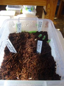 This year, we started a new method of starting seeds. We used to make paper pots for them, but this year we are starting seeds in boxes, so that the setup looks like this: