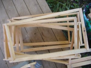 to prepare for the swarming, i have been putting together frames for the honeycombs. the frames look like this: