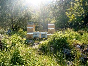 the only picture that really matters is of the hives these days. still, i will try to post a few more, my internet connection permitting. if that pile of hives looks impressive, let me point out that only the two white ones actually have any bees in them at the moment. however, the cedar ones are there for a reason; any day now, we are expecting the bees to swarm. it is all that anyone with bees is talking about lately. one day, we will find a ball of bees hanging off a tree branch somewhere not too far from the hives, and we will have to go get that ball of bees (the swarm) and induce them to enter the hive. apparently, swarming bees are not aggressive, and there is a good reason for that — they are full of honey. this is an interesting thing that i have learned about bees. they gorge themselves on honey in certain circumstances. one of these is when they are off to find a new home. another is when they are under attack — they will eat the honey in preparation of fleeing. so when their bee bellies are full of honey, they are less likely to sting. still, i think we will wear the bee suits for the courting of the swarm!
