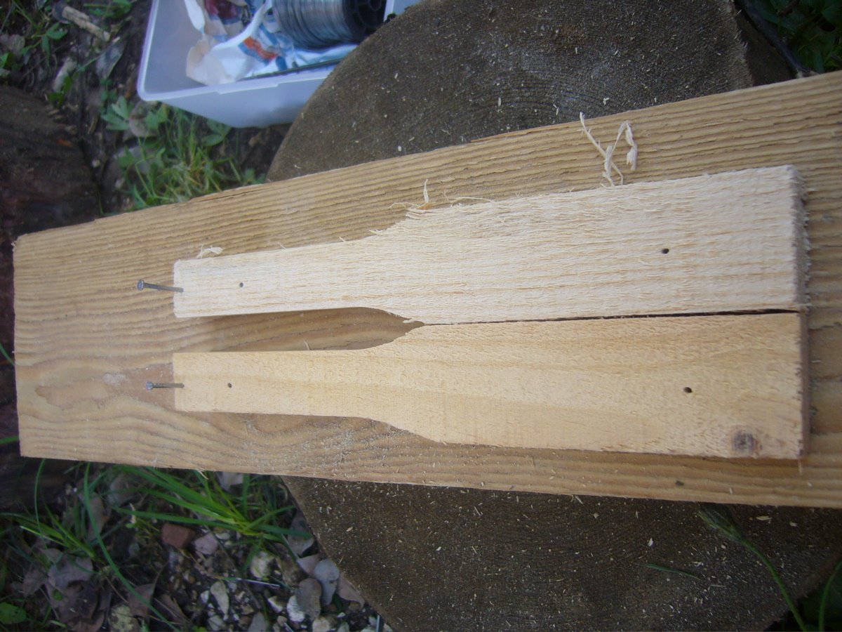 that is not what they looked like when we bought them, though — they came as a sack of bits of wood. i figured out a system to put them together quickly. first, make holes for the wires that will hold the wax, and get the nail into the top of the short ends: