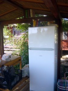 The fridge is among us, and it it mighty. The outside kitchen is effectively a shrine to the fridge now, since it dominates the entire space with its cold, white authority. baki munches on ice cubes, i drink cold water until i get a headache, you get the idea. i am very happy to have it, and the rearranging that we have done in the wake of its arrival has made the kitchen feel more kitcheny. the cupboard that we used to use as a fridge is next to the kitchen now, and serves as a sort of pantry.