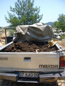 >how to fertilize is a question that we go over and over in our minds and our garden, and the solution of the day is… manure tea! we have 100 liter metal tank at the top end of the land and a big big pile of manure from our neighbor right by the gate. ali brings the stuff back by the truck load.