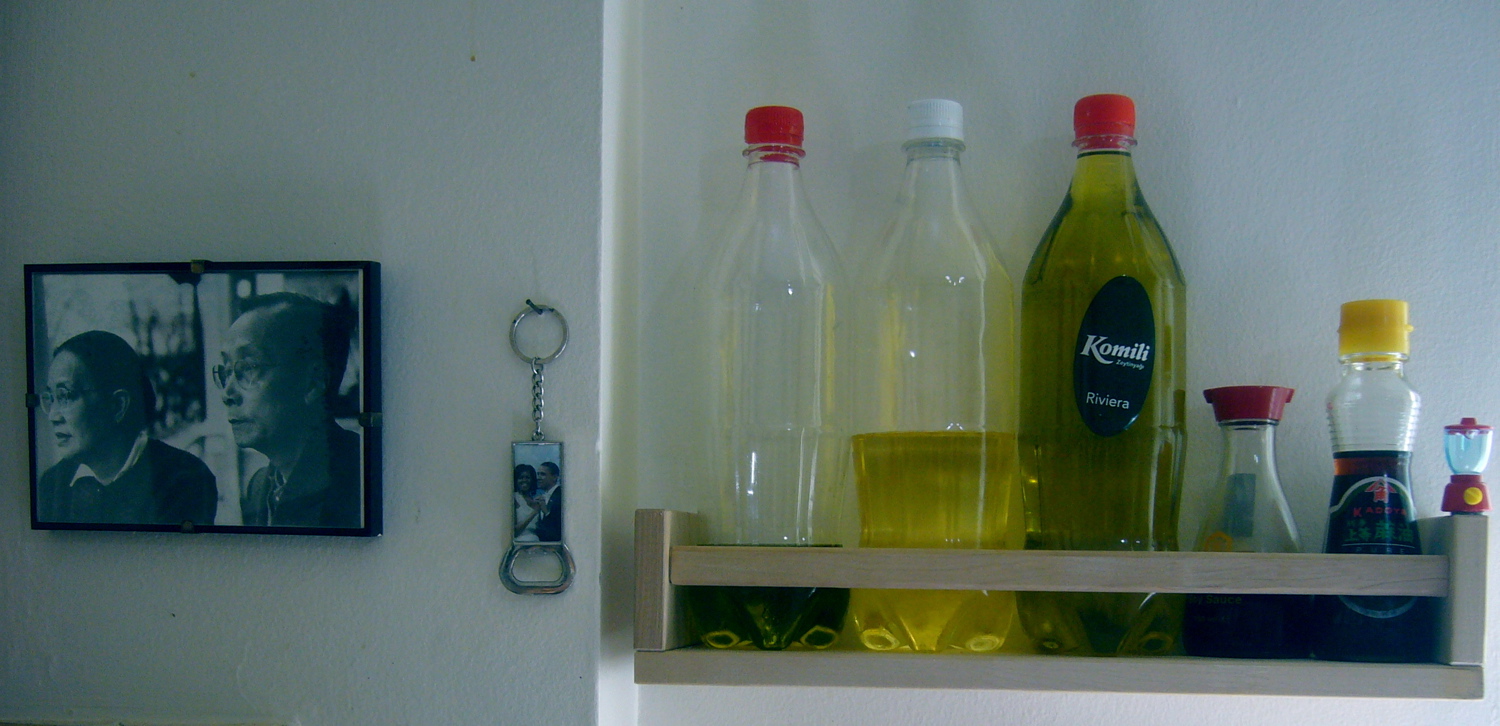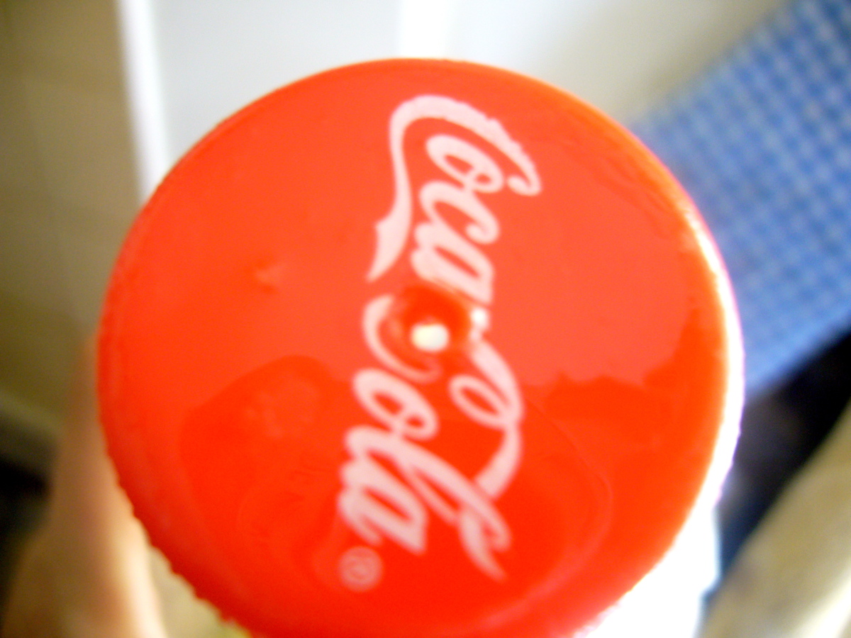 Yes, it’s our old friend the cola bottles. This is my solution to the drippy bottle of oil problem. I buy oil in big 5 litre cans, and they are unwieldy to say the least, so I decant them into cola bottles and then poke a hole into the cap. I use a screw for this, or a hot skewer, depending on how I feel about fumes that day. The cola bottles are nice and squishy, so it is really easy to just squirt oil into a pan and there is no dripping — they just suck back in when you let go of them. Perfect oil dispensers. Now, I won’t be upset if you are not as excited about this as my mom was, you understand. Here’s a blurry look at that hole: