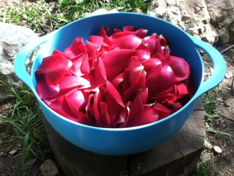 Any excuse to bring a basket of rose petals into the house is welcome.