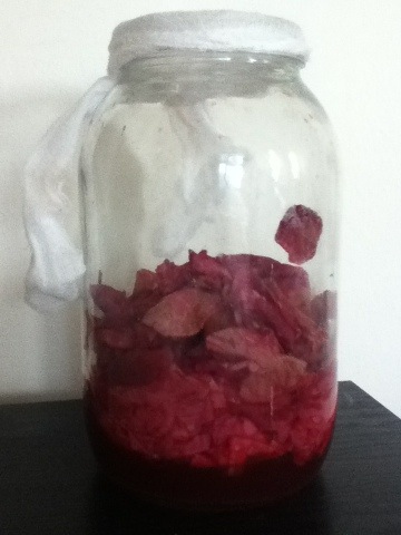 7. Take out the rose petals and add half of the sugar. Let this mixture sit for another week.