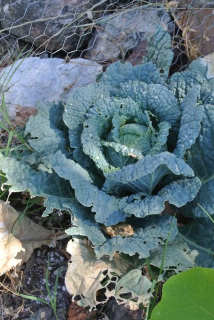 I was weeding in the keyhole beds when I noticed someone in the Savoy cabbage. Actually, I am surprised that the cabbages haven’t bolted yet in this heat, but just to be sure we’ve been eating them up. This is one of the last ones left. I’m sure this little fellow is going to miss it when we cut it!