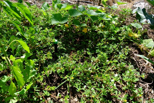 Purslane, making itself at home among cucurbits and peppers in one of the keyhole beds.