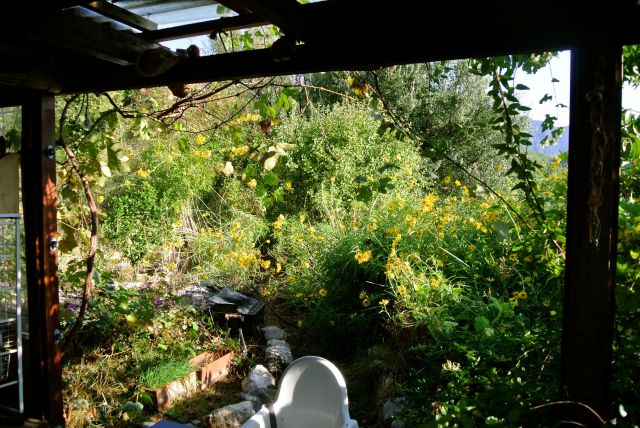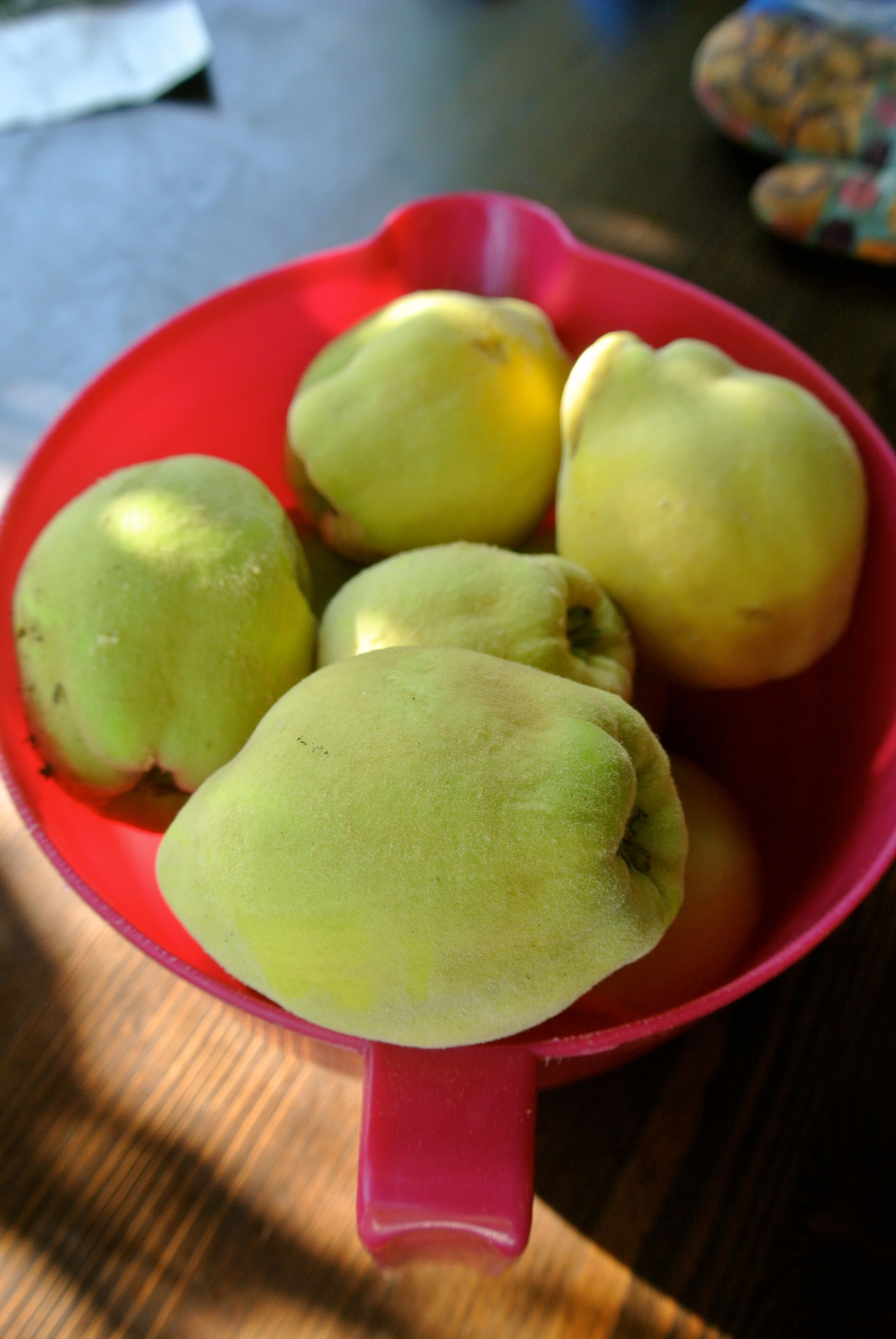 … there are quince, ready to be eaten. These might look green and unappetizing, but they are sweet and fragrant once you get them out of their fuzzy peels. Ali picked them from the tree, which was bent almost double under the weight of the fruit, and we’ve eaten plenty of them already. I will be making quince jam this week, and will post the recipe. It’s my mother-in-law’s no-fail easy-peasy pressure-cooker quince jam.