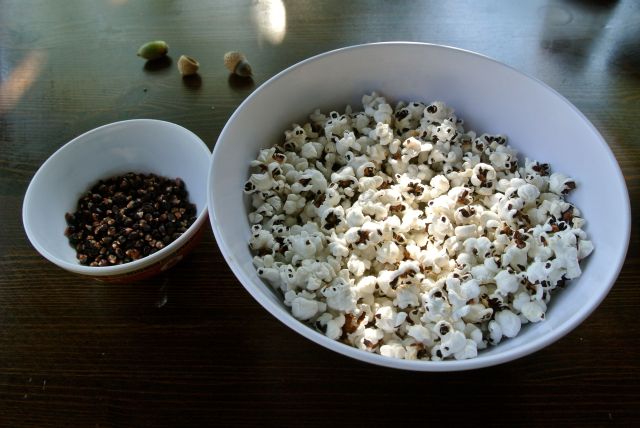 … there is a bowl of popcorn from the garden. Baki and I planted some Dakota Black popping corn and we harvested it a few weeks ago from skeletal, dried out plants. Out of the blue, Baki asked for popcorn this morning right after we ate breakfast, so we tried it out. After much energetic popping, I am pleased to report that it is unbelievably tasty — I swear, it tastes buttery! I like, too, how it looks burnt, but it’s just the hulls and kernels from the corn.
