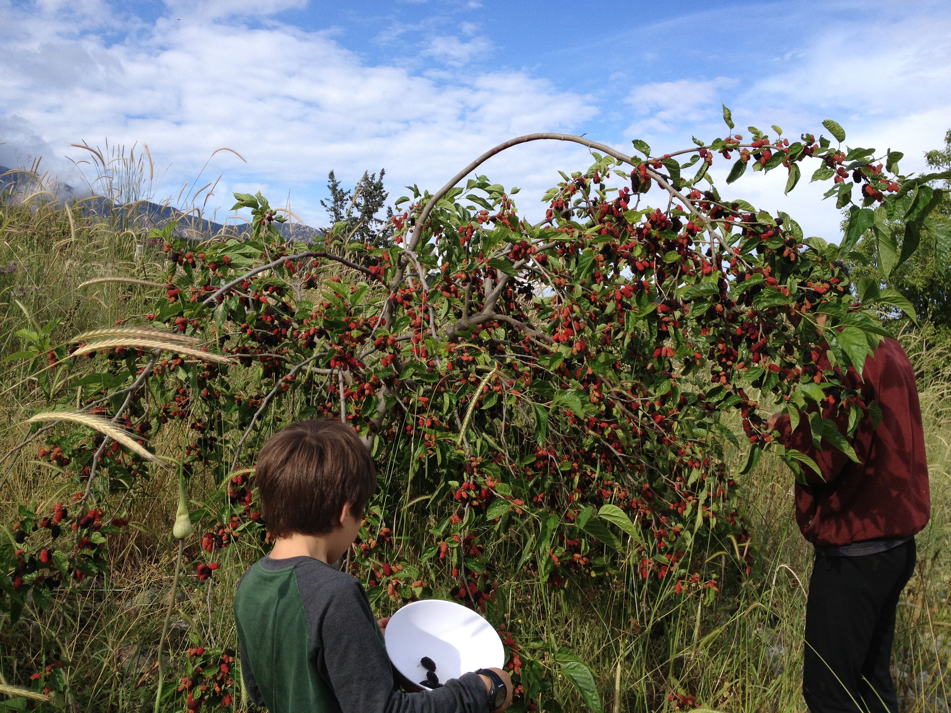 The mulberry tree is fruiting, and pretty heavily at that. Between the fruit and the rain, some of the branches drooped all the way to the ground. Of course, this is the nice thing about young trees — they are still small enough to be able to reach up into them with your feet on the ground. We had two big bowls at the end of our picking session, even with Kaya on my back, eating every other one. I made a mulberry cobbler with creme anglaise (Ali has been collecting eggs but not eating them, so we have about 20. This made 7 egg yolks seem not like an extravagance, but a blessing. I will be making meringues for Baki tonight with all of those whites). This reminded me that last year we discovered together that they somehow get tastier when you cook them. I hope that you will make it here in time to have some — there are plenty more still on the tree.