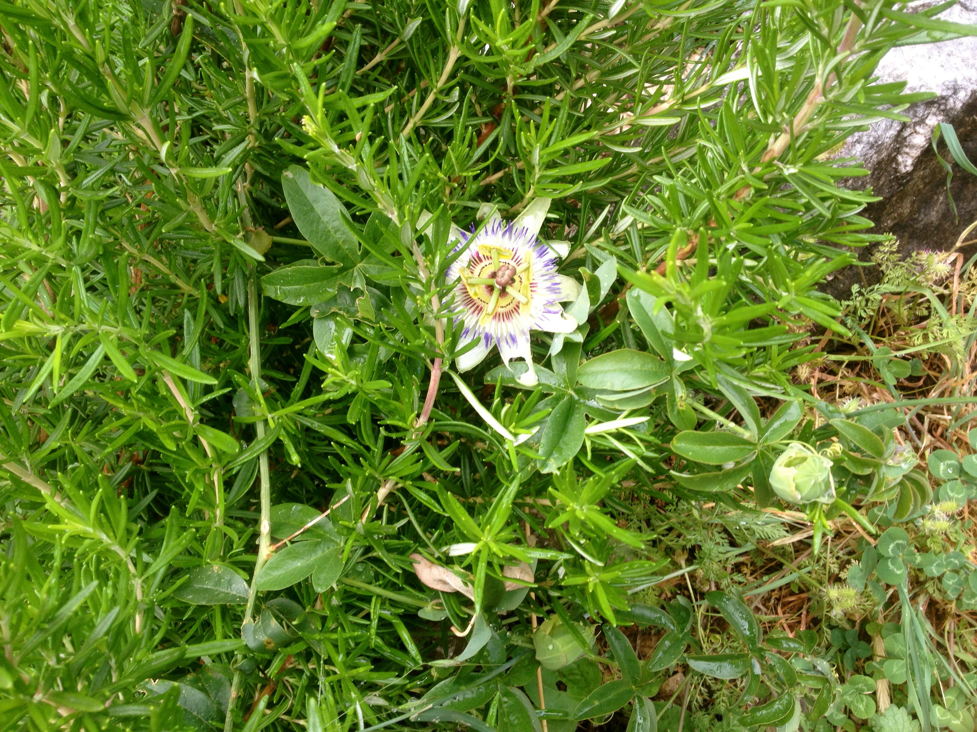 The red rose is mostly finished, but there are lots of other flowers popping up everywhere. And when I say popping up, I do mean that they are emerging in unexpected places. There are the sweetpeas that self seeded again, and snapdragons are also opening up everywhere. And look what I saw when I went to pick a sprig of rosemary from that plant we put up by the pecan tree (which is very big now, and will meet with your approval I am sure):