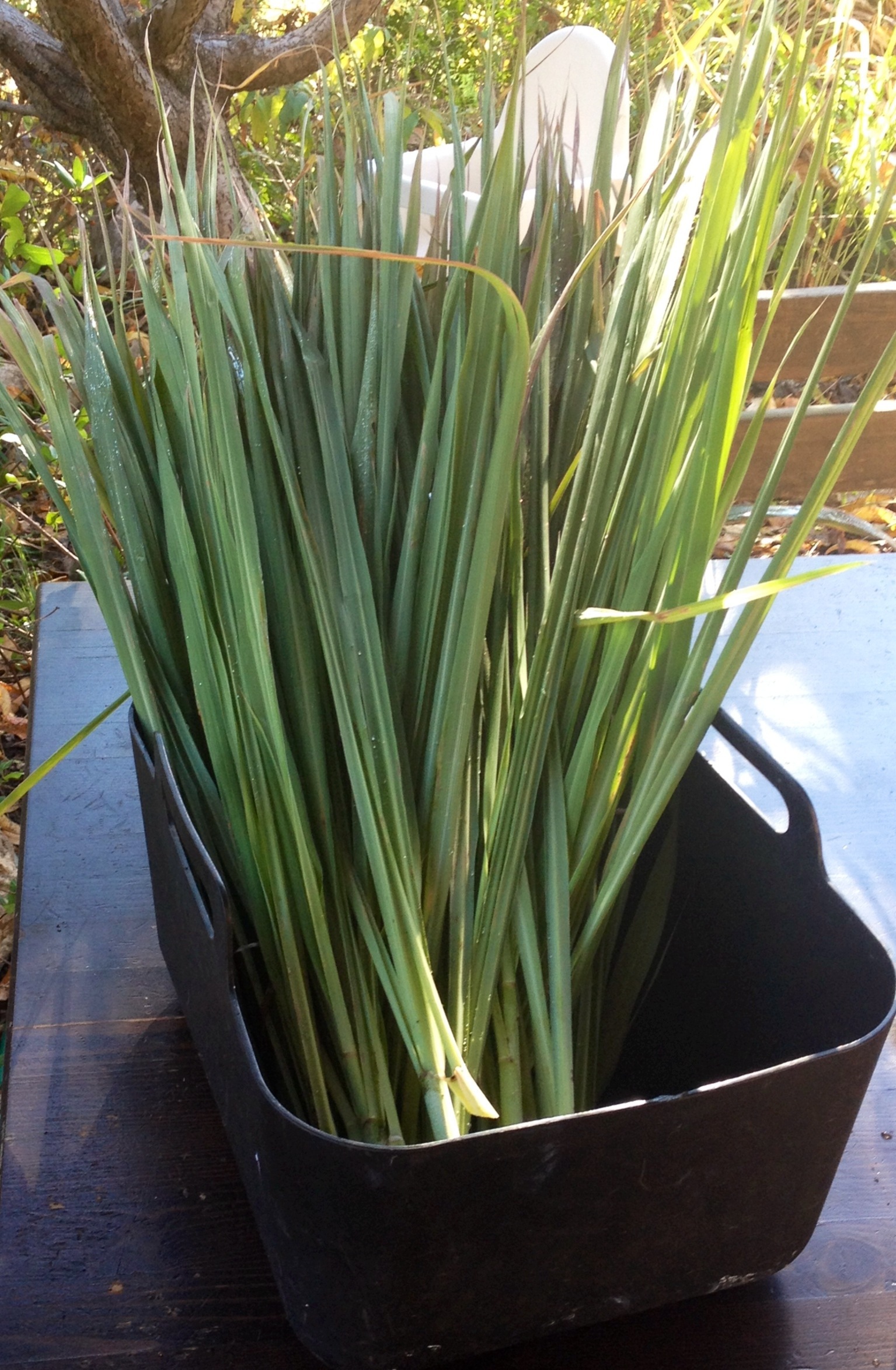 Our bathtub is full every day in summer, but now all there is inside it is a bunch of peach leaves. There is snow on the mountaintops and the temperatures in the garden have dropped to a cool 40 F in the sun. This may sound warm, but the lemongrass doesn’t think so! It’s that sad looking mess by the tub. Luckily we have a few other clumps, one of which is still very green, so I cut some for winter.
