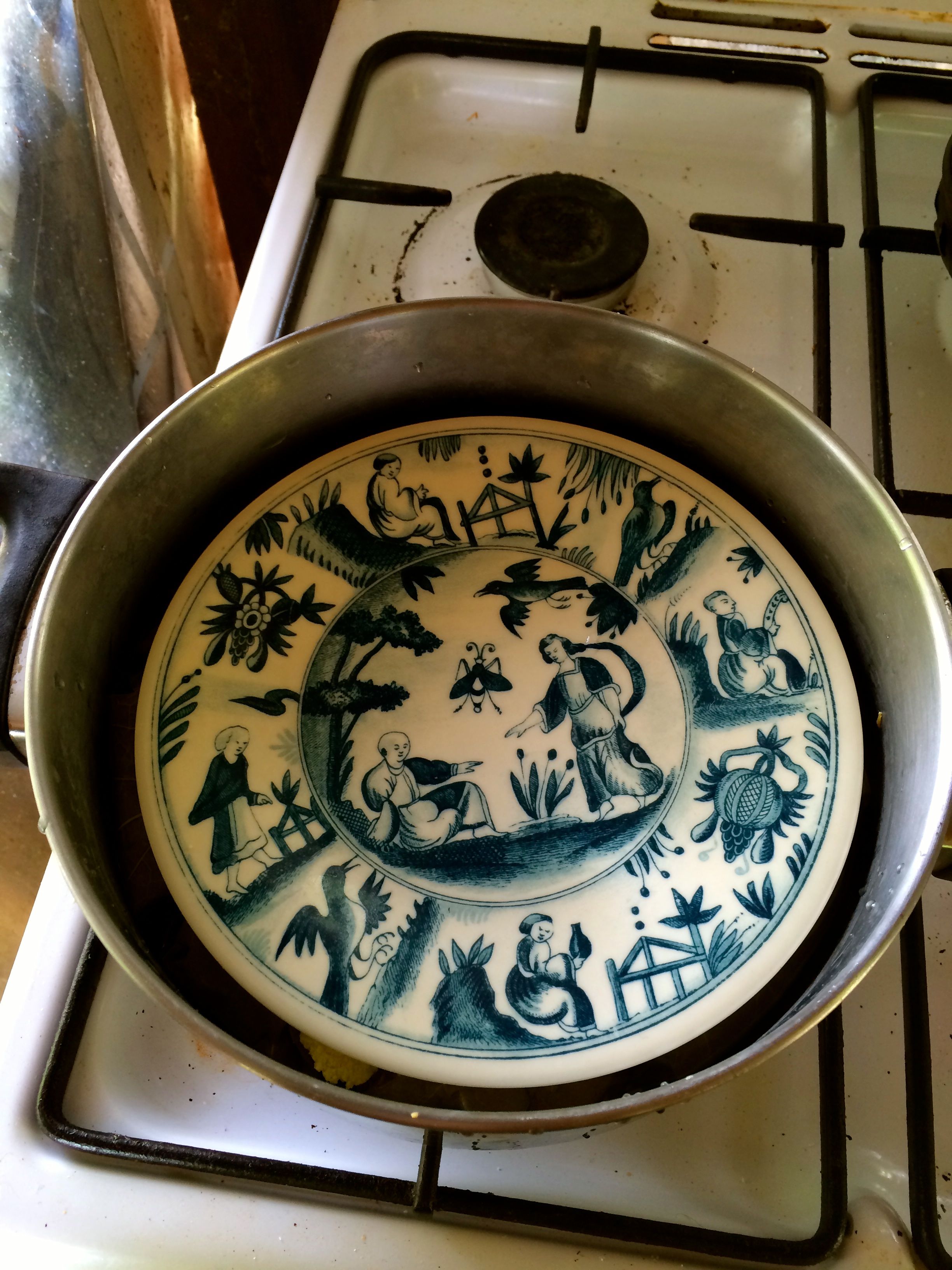 Since you’ve gone to all the trouble of finding a plate that will actually sit snugly inside your pot, be a good fellow and weigh that plate down or you will end up with floating dolma buoying the plate in a most dismaying manner. I used my meat pounder, but a big tin of tomatoes or beans would also do the trick.