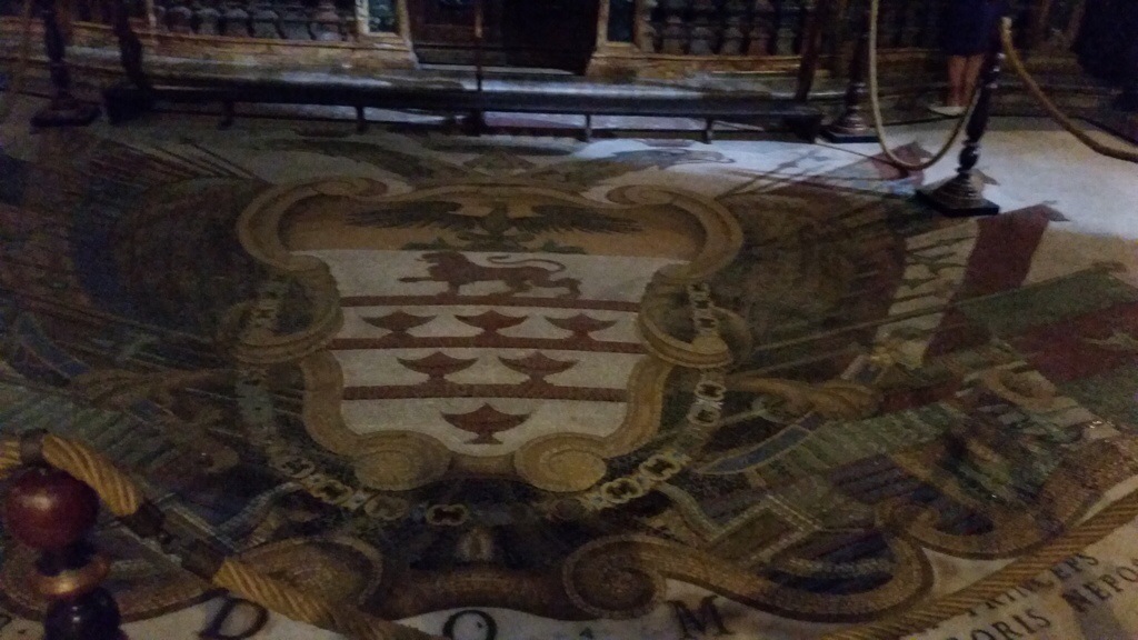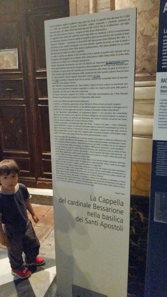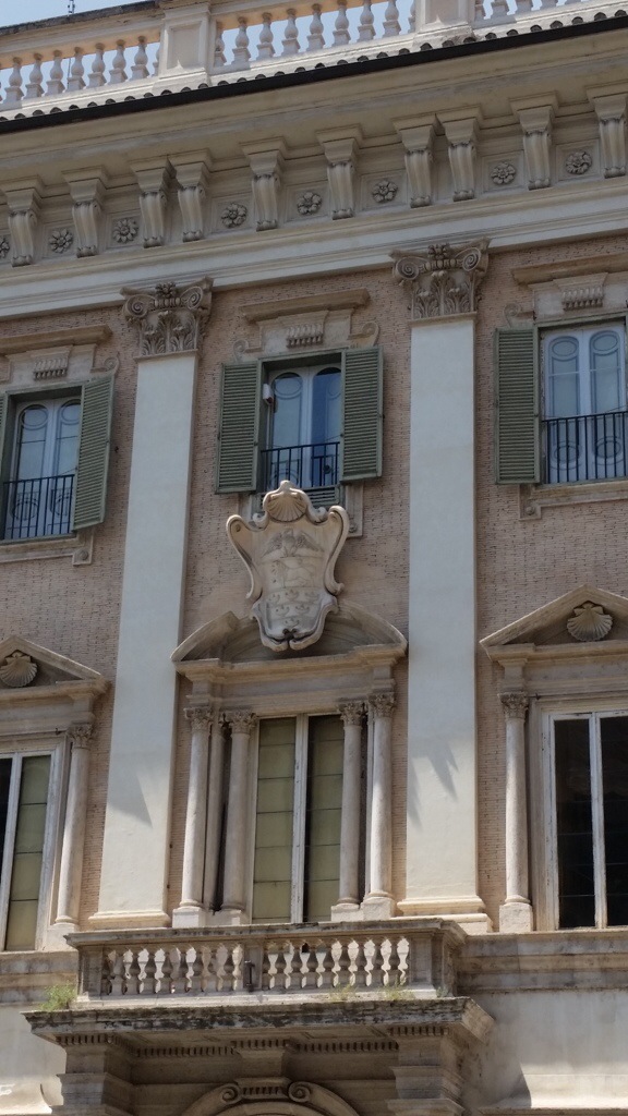 2. Go to Piazza Santi Apostoli. Admire the palace facing the church. Which family owned it? Note their “stemma” (family crest). Then enter the church and find a spectacular floor mosaic witht this same stemma, with additions showing where this nobleman fought for and against whom. Birds, sheep and banners. Then quietly enter the crypt. Who are the two apostles and who is buried in the chapel to the left (father of Pope Julius II) and at the opposite end is a fake catacomb grave. She is a girl with wo fish called __________. What room with frescoes has recently been opened to the public?