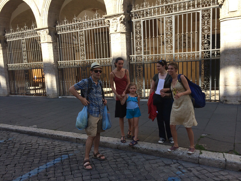 Well the answer turned out to be quite different. About 6 weeks before our trip, a Leslie had written us about a museum that hadn’t been there when we were in Rome. It was apparently some sort of reconstruction of a Roman home that you could join tours to see. The only upshot was that you had to book in advance, and this we failed to do. Imagine our surprise to find ourselves brought to the door of that very museum, which is housed beneath the Ufficio della Provincia, by the hand of the treasure hunt. Matt and Leslie went in to see if we might not be able to secure last minute tickets and emerged with a reservation for the 3 o’clock tour.