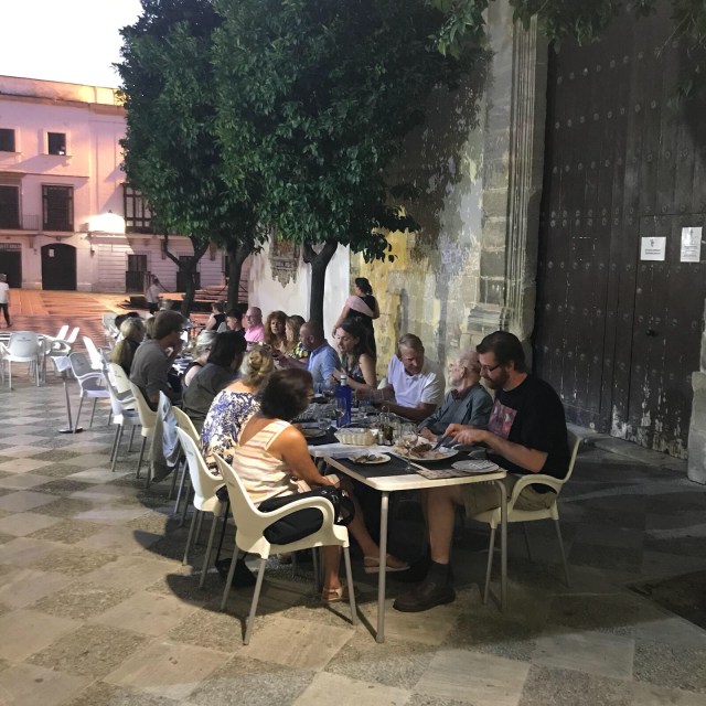 The boys now and adore one of their second cousins who is just Baki’s age, but met an entire branch of the family from the Netherlands that neither they nor I had ever met. I remember dimly seeing a birth announcement sent to my aunt Georgina announcing the arrival of twins shortly after my father died and these twins, now 9 years old and their elder brother, 11, were the children chasing Kaya through the square that night. Baki discovered, to his delight, that he had another relative his own age and they spend days talking to one another as fast as they could get the words out. By the time we dispersed after our final dinner together, the boys were truly saddened to have to say goodbye and it was with heavy hearts that we said our final farewells and got on our early plane home. Feeling the tug of sadness, I was reminded of my father telling me gently that it is a good sort of pain to feel blue at the end of a journey because it means that it has touched you. I repeated it to the boys (“Do you know what Grandpa would say to me when I was feeling sad about leaving somewhere?…”) as we soared over the streets of Jerez, bound for home and their father who had missed them so.