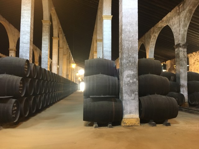 And this is how I came to find myself stepping off the sunny, silent street in Jerez into a courtyard that was shaded by a thick canopy of grape leaves. I had felt a bit odd bringing a baby along with me on a tour of a winery but I needn’t have worried, as the only other people who showed up were a couple with a young child fast asleep in a stroller! We turned in unison as a large door swung slowly open and a young woman in a white lab coat summoned us inside. Stepping through the door, we found ourselves in a massive, vaulted chamber with rows of barrels lined neatly among the pillared arches. A sweet, yeasty smell presided over the bodega, cool due to its thick walls, with thick woven mats of grass blocking the sun and sandy floors that could be dampened to maintain humidity. Our guide led us through the ruminating barrels, stacked three high so that it felt slightly as if we were in a city of barrels, walking the empty silent streets, only these were cool and dark. “The spiders we keep,” our guide was saying, “as they help us by… eating… little tiny animals.” The cobwebs swayed in the faint air currents as we walked past.